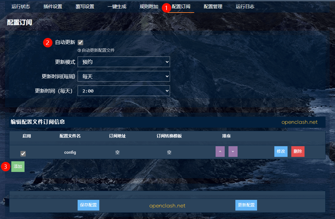 1、打开 OpenClash → 点击「配置订阅」 → 勾选「自动更新」 → 点击「添加」,如下图