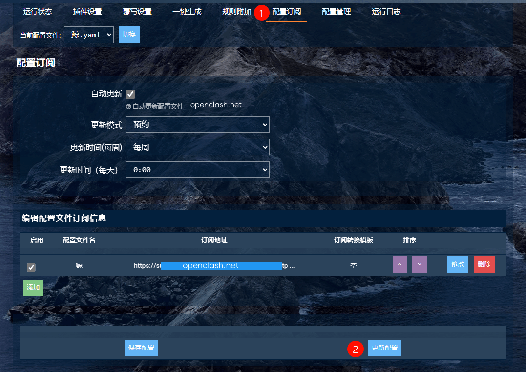 3、返回「配置订阅」 → 选中添加的配置文件「更新配置」,如下图